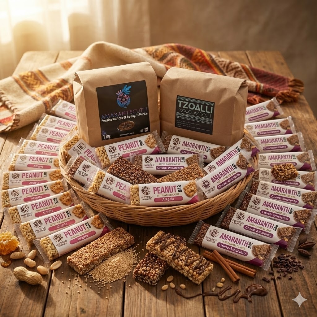 La experiencia definitiva de nutrición ancestral. Incluye: 1 Xocolapinolli (bebida ceremonial), 1 Amarantecutli (polvo de élite), y 40 barras de amaranto surtidas en diferentes sabores. Todo lo que necesitas para optimizar tu rendimiento con superalimentos ancestrales de máxima calidad.